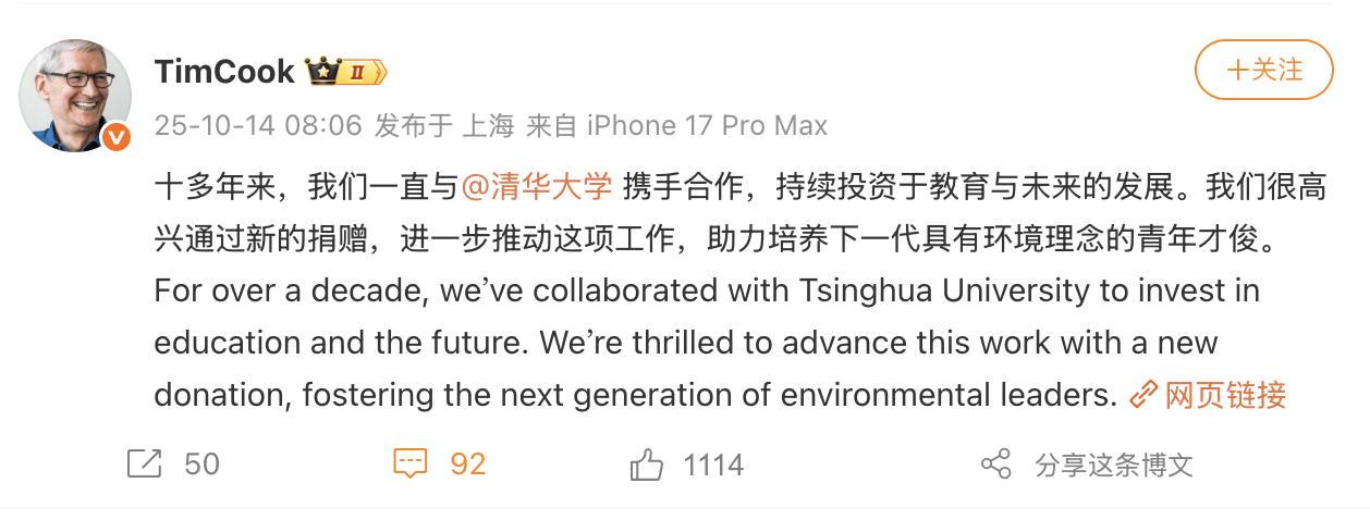 同日,苹果公司亦通过微博平台同步传递合作信息,强调“十多年来,我们一直与清华大学携手合作,持续投资于教育与未来的发展。我们很高兴通过新的捐赠,进一步推动这项工作,助力培养下一代具有环境理念的青年才俊”。