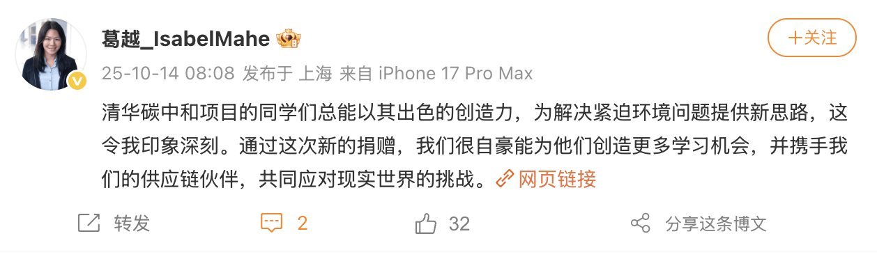 苹果公司大中华区高管葛越(Isabel Mahe)也在微博中分享感受:“清华碳中和项目的同学们总能以其出色的创造力,为解决紧迫环境问题提供新思路,这令我印象深刻。通过这次新的捐赠,我们很自豪能为他们创造更多学习机会,并携手我们的供应链伙伴,共同应对现实世界的挑战。”