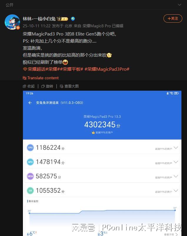 众所周知,荣耀与高通有着深度合作的战略关系,得益于此,设计团队对荣耀MagicPad3 Pro的性能调优丰汇投资,肯定是更手拿把掐的。此前,荣耀产品经理@林林-一枝小白兔林林就对荣耀MagicPad3 Pro 3进行了安兔兔跑分,430+W分的总成绩实在让人叹为观止。
